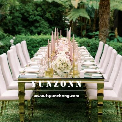 | Productnaam: | Zware Rechthoekige Banketzaal Lange Tafels Washington Goud Deco Eettafel Evenementen Feesten Hotel Meubilair Glas Metaal |